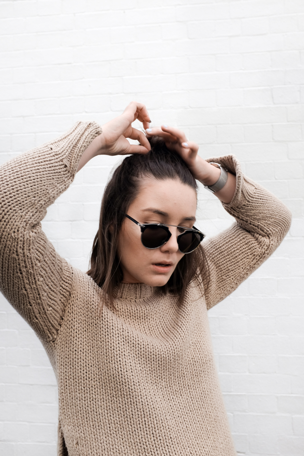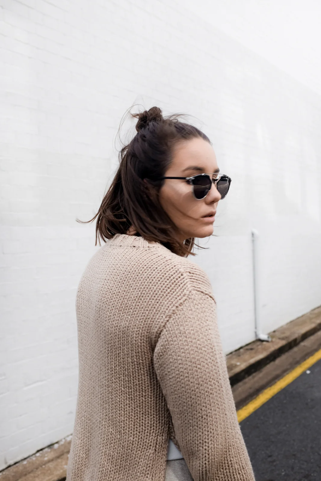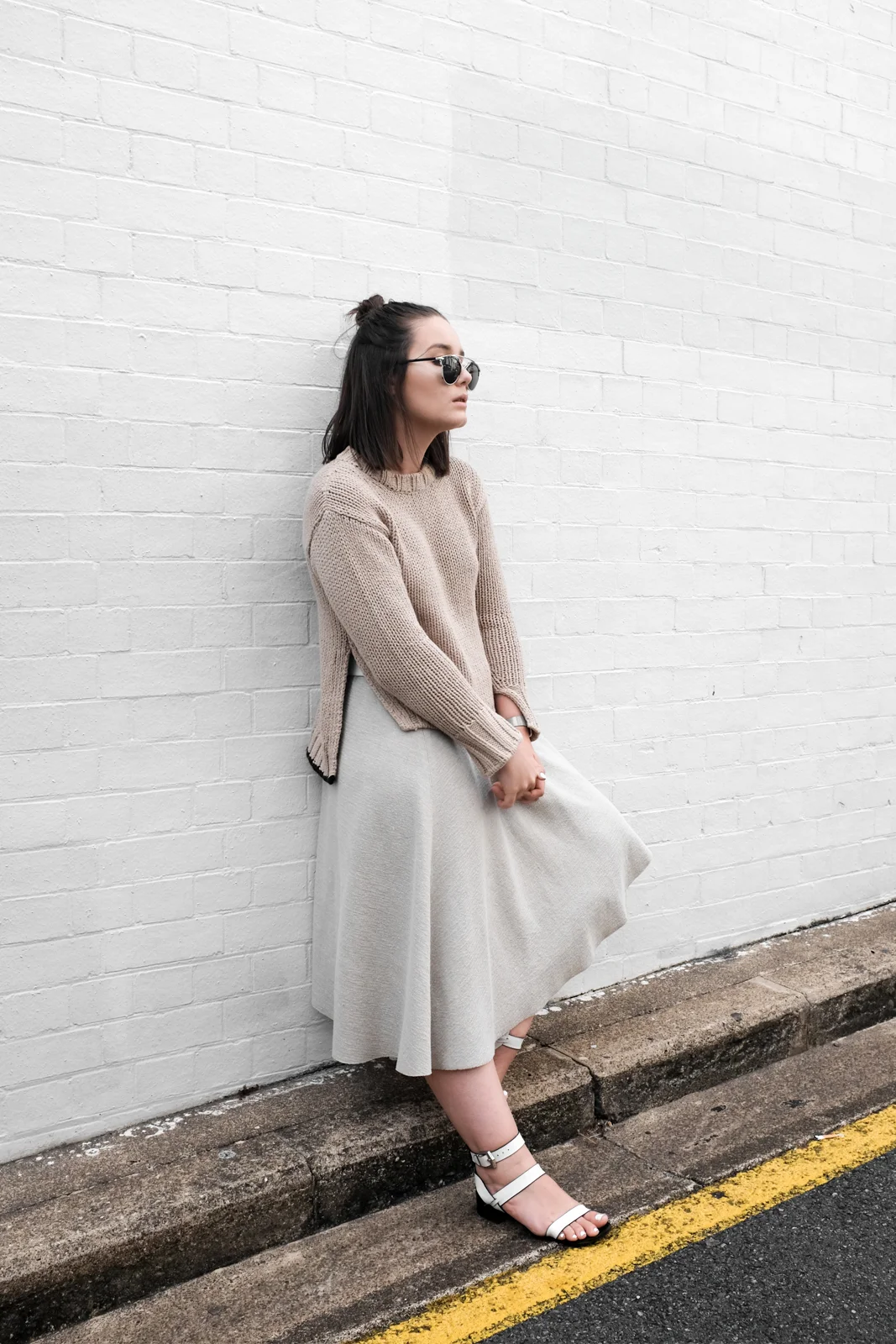 I think transeasonal dressing is where my personal style really thrives. If anyone was to ask me what my go-to uniform look would be it would be me wearing a midi skirt, top (either a basic tee or knit) and killer eyewear. Which is kind of perfect for Spring/Autumn - those in-between months where you're not running between air conditioned spaces or layering up like there is no tomorrow. The midi skirt providing length yet still light, with a chunky knit added for the cooler winds. Known for their attention to cut and organic fabrication today I went for all nude tones from Bassike. Bassike is just one of the Australian designers that is now available through Farfetch.