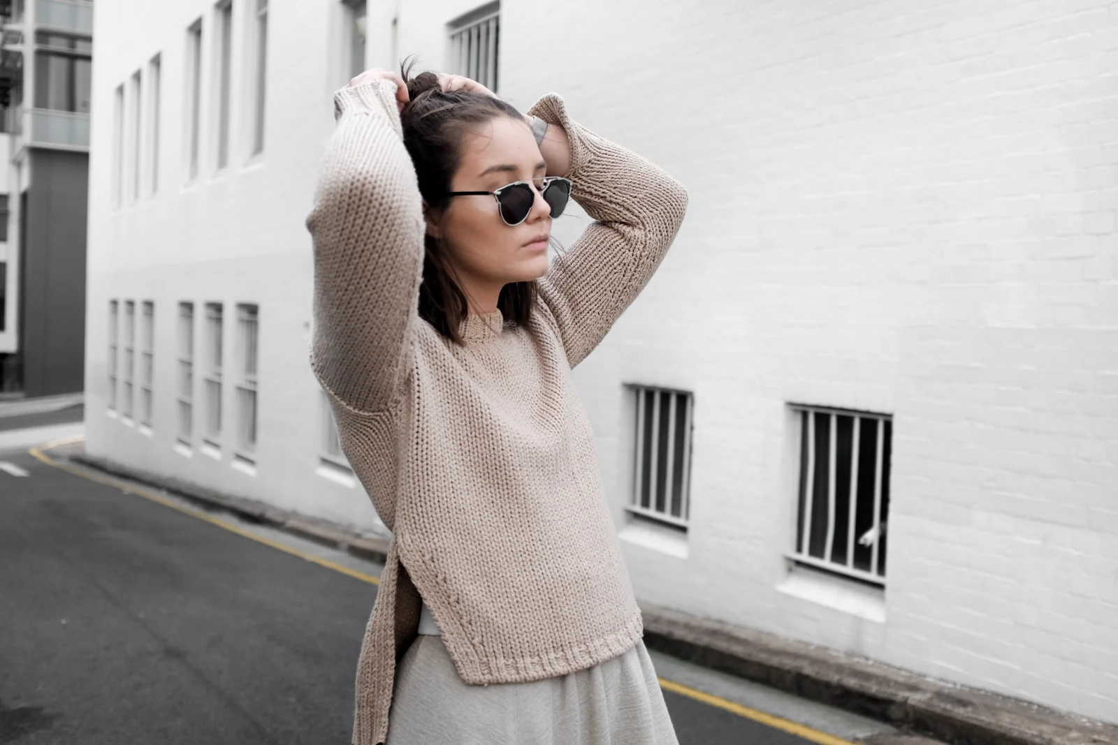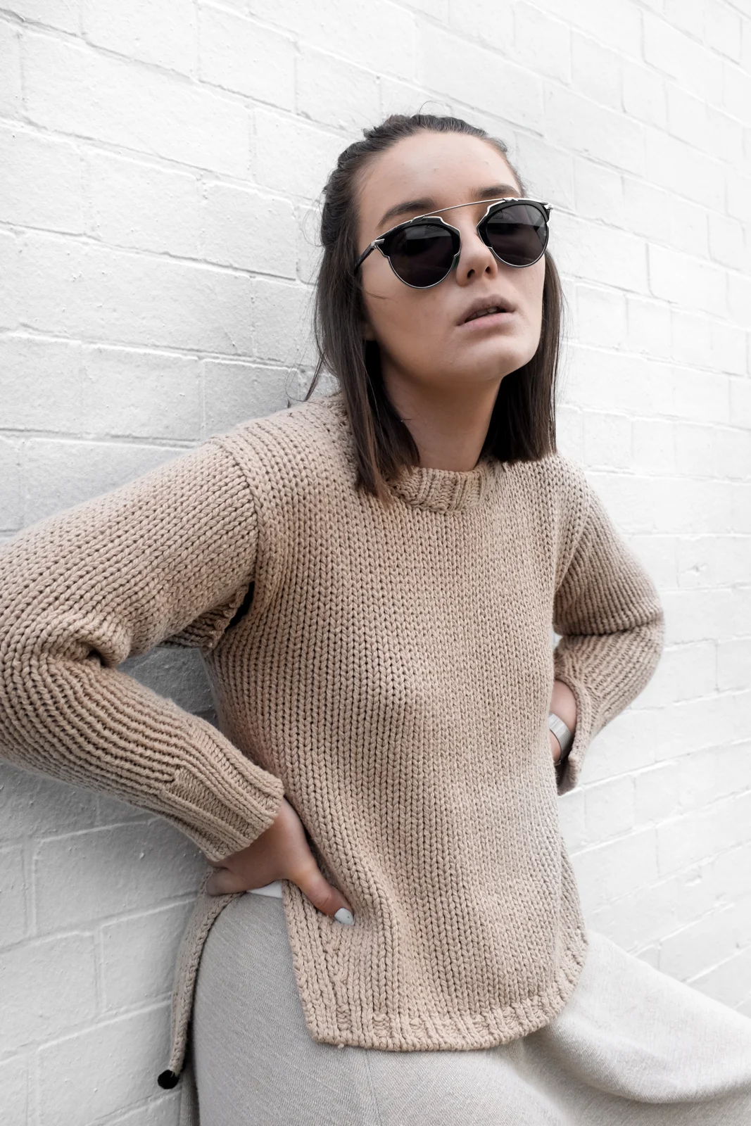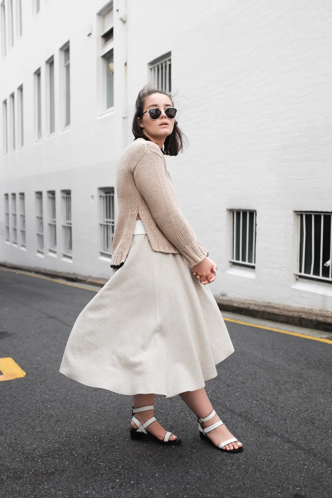 I think transeasonal dressing is where my personal style really thrives. If anyone was to ask me what my go-to uniform look would be it would be me wearing a midi skirt, top (either a basic tee or knit) and killer eyewear. Which is kind of perfect for Spring/Autumn - those in-between months where you're not running between air conditioned spaces or layering up like there is no tomorrow. The midi skirt providing length yet still light, with a chunky knit added for the cooler winds. Known for their attention to cut and organic fabrication today I went for all nude tones from Bassike. Bassike is just one of the Australian designers that is now available through Farfetch.